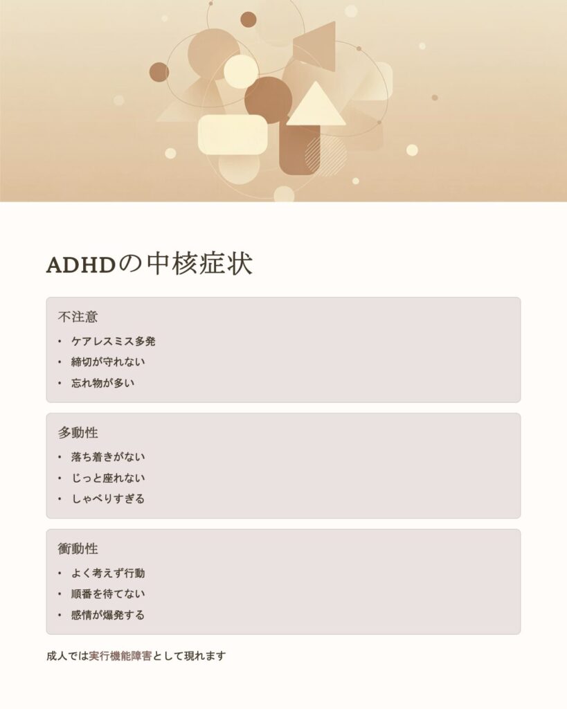 成人では、「わかっているのに出来ない」「計画性のなさ」「先延ばし」「時間管理の苦手さ」など、**実行機能障害(executive dysfunction)**として現れることが多いです。