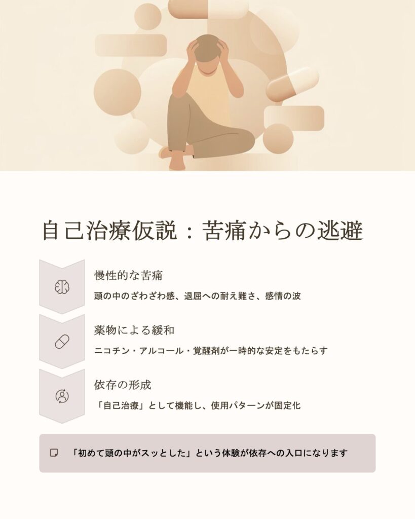 - アルコール → 不安・緊張の緩和、自己否定感の麻痺