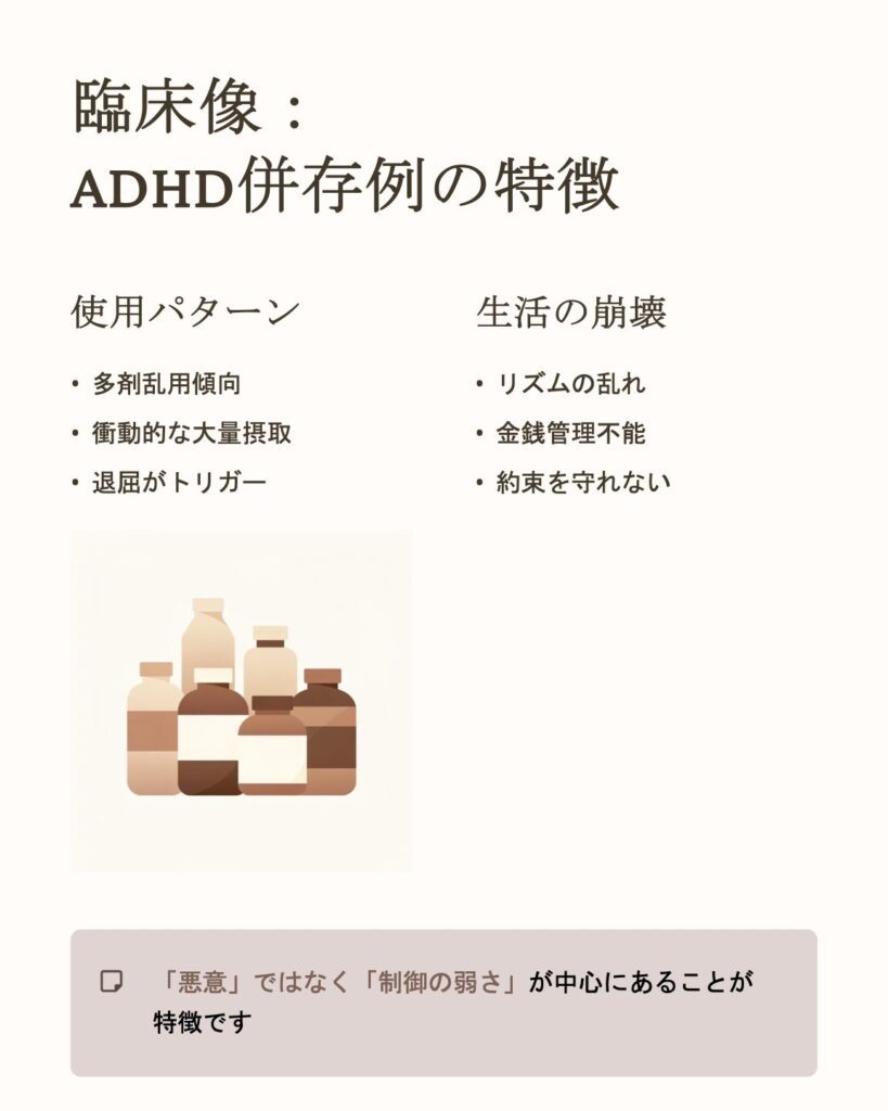 - 「依存症の影響」と「本来の ADHD」を見分ける