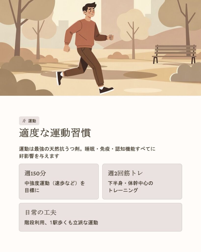 運動は「最強の天然抗うつ剤」とも言われ、睡眠・免疫・認知機能すべてに好影響。