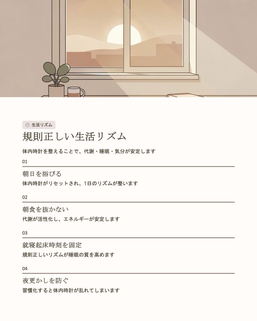 体内時計を整えることで、代謝・睡眠・気分が安定。