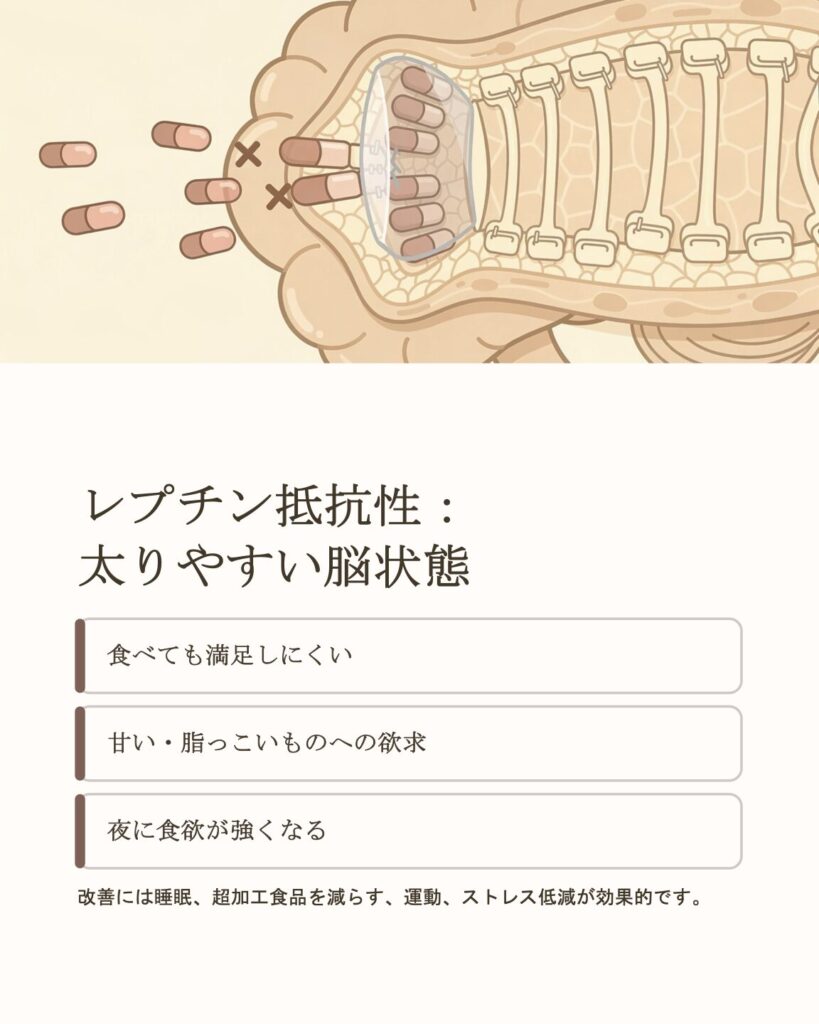 でも体脂肪が多い・慢性炎症・睡眠不足などが重なると、脳がレプチン信号に鈍くなる(抵抗性)ことがあります。