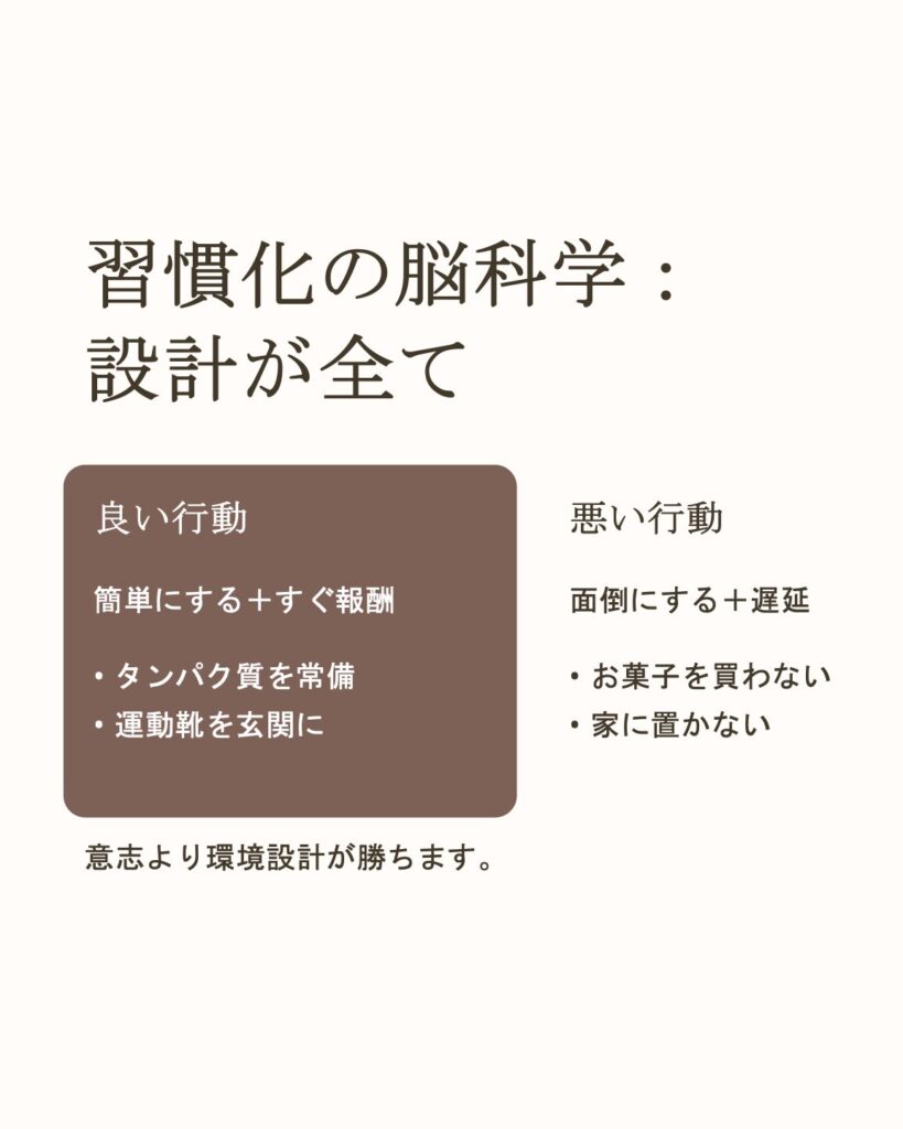 習慣は「意志」より **報酬予測+摩擦(手間)**で決まります。