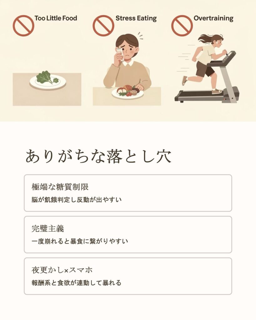 - 極端な糖質制限・断食を急に → 脳が飢餓判定し反動が出やすい