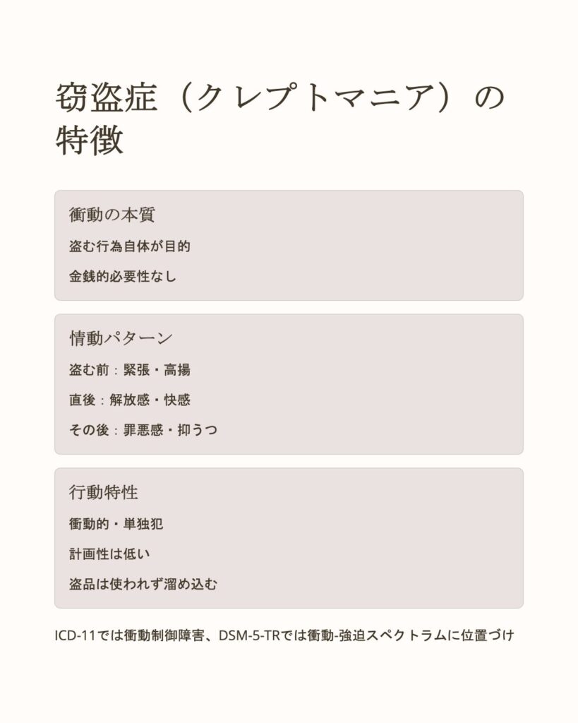 - 窃盗症:「盗む行為」そのものが目的(衝動の解消)