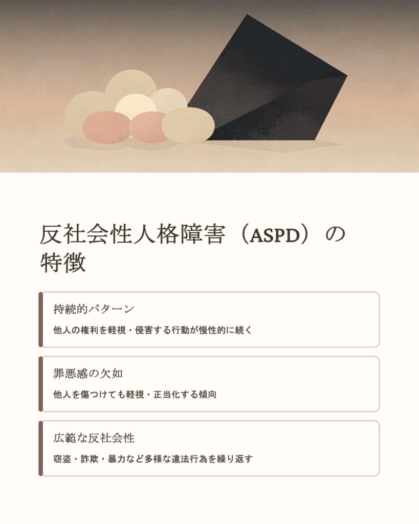 - ASPD:持続的な虚言・無責任・暴力・寄生的生活など、人生全体に反社会性が染み込んでいる