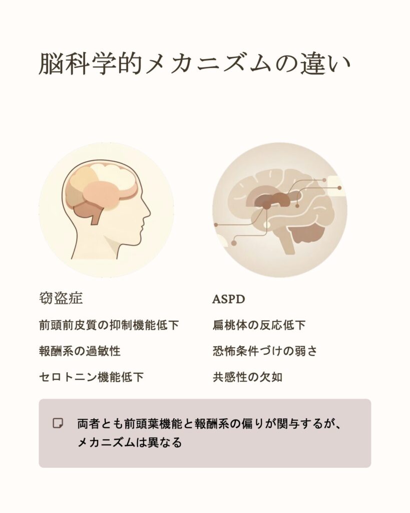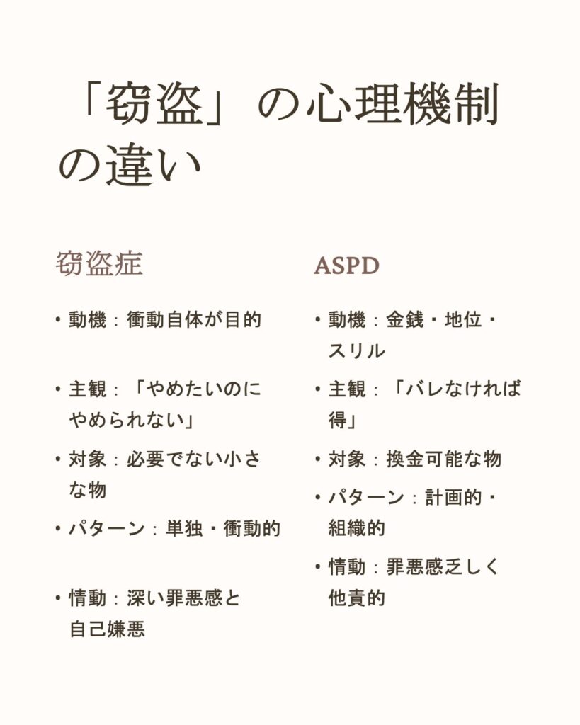両者とも「窃盗」をしますが、その心理機制・動機・背景が異なります。