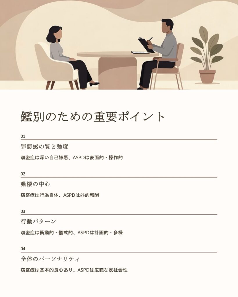 - 臨床場面では、窃盗症に反社会的な特徴が重なっているケースや、ASPDの中に「衝動制御障害様」の側面が混じっているケースもあり、純粋に分けられない場合もある
