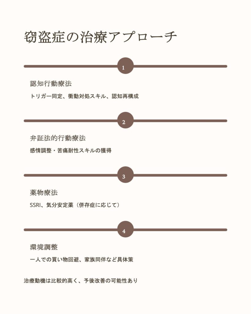 - 窃盗症:深い罪悪感と自己嫌悪があり、治療への動機も比較的高い