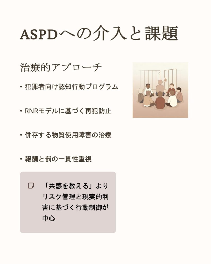 - ASPD:罪悪感が乏しいか、表面的・操作的(「反省しているふり」)
