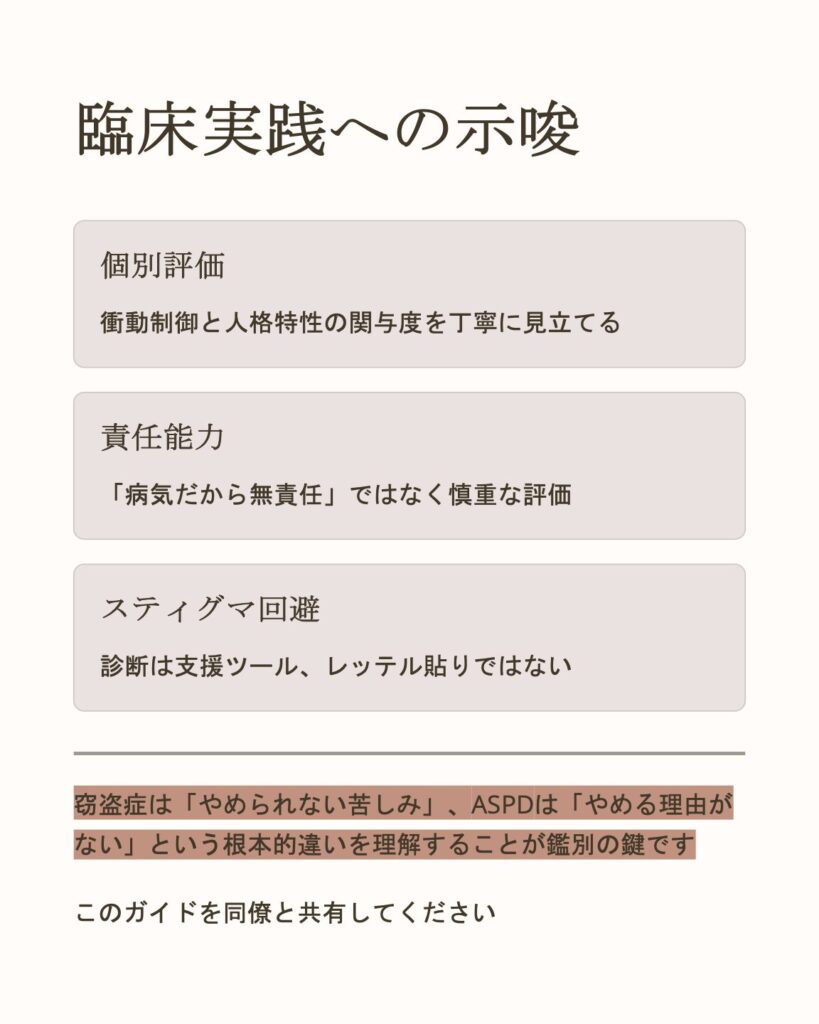 - 窃盗症もASPDも、責任能力の有無は個別に慎重に評価すべき